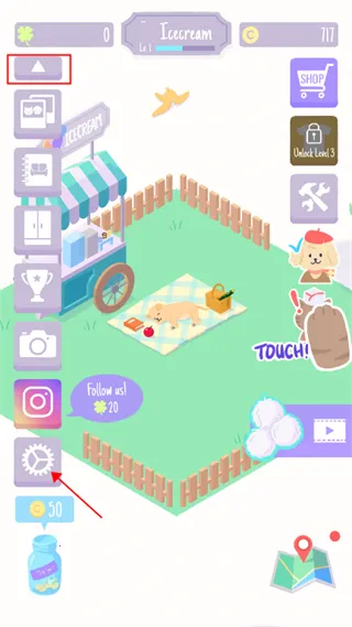 1、进入游戏后,如图所示点击左边箭头图标,然后下拉会出现齿轮状设置按键,